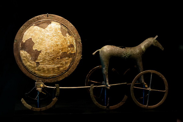 Wózek z Trundholm pozostawił archeologom więcej pytań niż odpowiedzi, ponieważ został znaleziony sam, bez żadnych innych historycznych artefaktów w pobliżu. Krążek jest jednostronnie złocony i ozdobiony bardzo dekoracyjnymi koncentrycznymi pierścieniami. Wielu wierzy, że symbolizuje wschody i zachody Słońca, z uwagi na kierunkem ruchu.