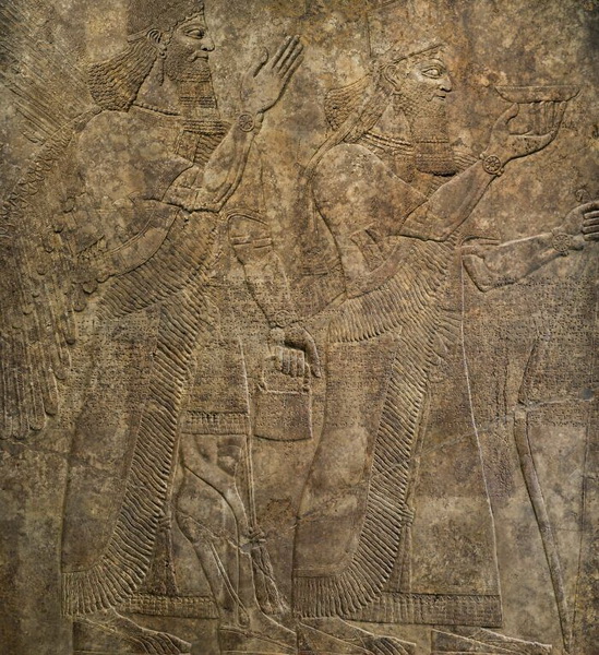 Ta płaskorzeźba przedstawiająca króla Aszurnasirpala II, znajdująca się obecnie w Luwrze, pochodzi z pałacu Nimrud w Asyrii, gdzie zakrywała część niewypalonej ściany z cegły.