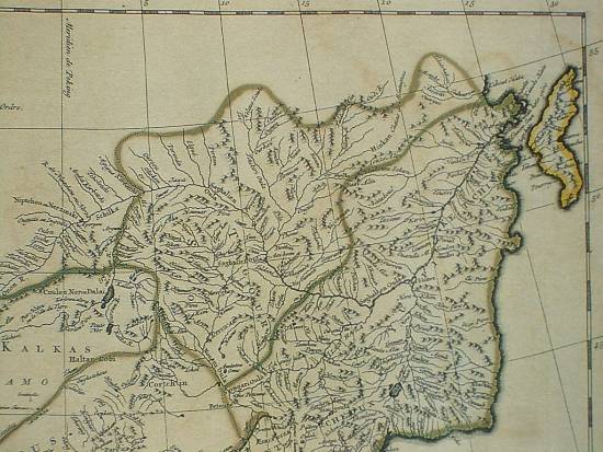 Fragment francuskiej mapy przedstawiający chińskie posiadłości w dorzeczu Amuru. Zaznaczono na niej między innymi miejscowość Jaxa (Ałbazin) (Jean Baptiste Bourguignon d'Anville, 1734 lub 1737 r., opracowana na podstawie map jezuickich)