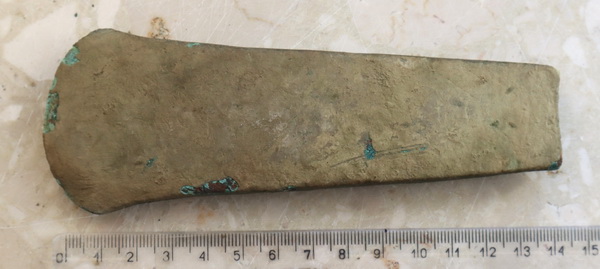 Siekierka, o imponujących wymiarach - długości około 14,5 cm i długości krawędzi tnącej około 5,2 cm, charakteryzuje się kształtem wysokiego trapezu, lekko rozszerzoną wachlarzowato krawędzią tnącą oraz lekko wklęsłym prostokątnym obuchem o wymiarach około 2,8 x 1 cm. Jej przekrój poprzeczny jest prostokątny, natomiast przekrój podłużny zbliżony do soczewkowatego, osiągając około 1,5 cm w najszerszym punkcie. Niezwykle istotne jest także to, że waga znaleziska wynosi 678 gramów, co dodatkowo podkreśla jego wartość.