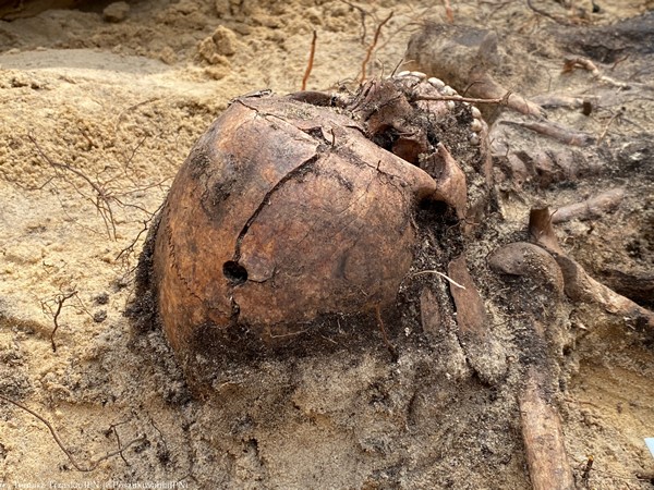 Obszar do badania wytypowano na podstawie wizji lokalnej przeprowadzonej w miejscu wskazanym przez świadka zbrodni. Jama grobowa o powierzchni ponad 13 m. kw. i głębokości 1,3 m. została zlokalizowana w wąwozie pomiędzy wydmami. Już w drugim dniu prac ujawniono pierwsze szkielety, ułożone ściśle, regularnie, w pozycji bocznej, niekiedy naprzemiennie. Podczas dalszego odsłaniania jamy grobowej ukazały się kolejne szczątki osób, których ciała wrzucono bezwładnie do grobu. Pośród szczątków osób dorosłych zostały odkryte szczątki dzieci, a także niemowląt. Wstępne badanie antropologiczne przeprowadzone przez specjalistów Biura Poszukiwań i Identyfikacji na miejscu prac pozwoliło ustalić, iż w tym miejscu pogrzebano ciała 35 osób, w tym 3 mężczyzn, 16 kobiet i 14 dzieci (w wieku od ok. 1 r.ż. do 14 r.ż.). Wiek i płeć pozostałych dwóch osób pozwolą ustalić oględziny antropologiczne przeprowadzone w najbliższym czasie. Przy niektórych szkieletach odnaleziono elementy odzieży (buty, paski, guziki, okulary).