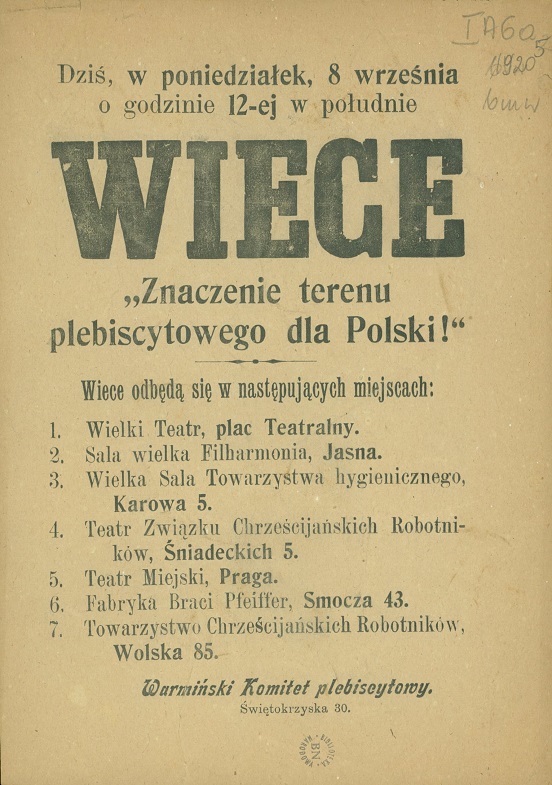 Jeśli przyjrzymy się bliżej stanowisku polskiego rządu wobec przygotowań do plebiscytu na Warmii i Mazurach, to łatwo dostrzec, iż nie stanowiły one priorytetu w jego ówczesnej polityce. Tego rodzaju podejście wydaje się do pewnego stopnia zrozumiałe ze względu na toczące się w tym samym czasie walki polsko-bolszewickie na Białorusi i Ukrainie oraz tlący się spór polsko-czeski na Śląsku Cieszyńskim i polsko-niemiecki na Górnym Śląsku. Mimo to w wielu miejscach Polski zaczęły rozwijać się społeczne inicjatywy, które stawiały sobie za cel walkę o przyłączenie Warmii i Mazur do Rzeczypospolitej. Wśród nich szczególnie aktywne były działające w Poznaniu Towarzystwo ku Wyzwoleniu Mazur, Warmii i Ziem Nadwiślańskich oraz powstały w Krakowie Małopolski Komitet Mazurski. Wyjątkowy charakter miał w tym kontekście utworzony z inicjatywy marszałka sejmu Wojciecha Trąmpczyńskiego w czerwcu 1920 roku Centralny Komitet Plebiscytowy, koordynujący działania na wszystkich obszarach plebiscytowych.
