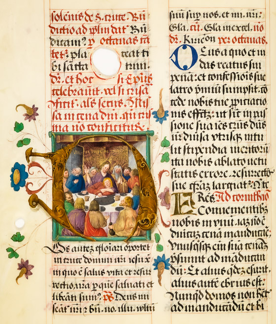 Inicjałem, nad którym także warto się zatrzymać (choć ten nie jest już wiązany ze Stanisławem Samostrzelnikiem), jest przedstawienie Ostatniej Wieczerzy (k. 47v). To nie jest moment ustanowienia Eucharystii, ale zapowiedź zdrady Judasza: słowa Chrystusa („Jeden z was mnie zdradzi”) napisane są ponad głowami zebranych w wieczerniku. Tradycyjnie rudowłosy Judasz siedzi na pierwszym planie, ściskając w dłoni sakiewkę. Postać sprawiająca wrażenie leżącej na stole to Jan Ewangelista, który – jak sam napisał w swej Ewangelii – „oparł się zaraz na piersi Jezusa i rzekł do Niego: «Panie, kto to jest?»” (J, 13:25). Takie ujęcie Ostatniej Wieczerzy, koncentrujące się na zdradzie Judasza, a nie na chlebie i winie, którymi Chrystus nakarmił swych uczniów, było bardzo popularne na przełomie średniowiecza i renesansu.