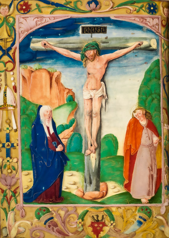 Omawiany tu Mszał zdobiony jest licznymi iluminacjami, ale tylko jedno jego otwarcie (k. 121v–122r) ma kompleksową dekorację obu sąsiadujących stron: pełne bordiury i całostronicową miniaturę. To najważniejsza część każdego mszału, czyli Kanon Rzymski: właśnie ten fragment jest w większości egzemplarzy najbogaciej dekorowany. Jest to jedna z najstarszych modlitw eucharystycznych, sięgająca zapewne czasów wczesnochrześcijańskich, a ostatecznie ukształtowana przez papieża Grzegorza Wielkiego (zm. 604). Zaczynała się ona od zwrotu: „Te igitur clementissime Pater…”, czyli „Ciebie przeto, najmiłościwszy Ojcze…” (dziś ten fragment mszy zaczyna się od słów: „Ojcze nieskończenie dobry…”; warto zauważyć, że współcześnie zniknęło pierwotne nawiązanie do wcześniejszych modlitw, które było zawarte w zwrocie „Te igitur”, czyli „Ciebie przeto”). To właśnie w tym miejscu w rękopisach sakramentarzy, a następnie mszałów, tradycyjnie umieszczano całostronicowe przedstawienie Ukrzyżowania Chrystusa. Dodatkowo często krzyż służył za inicjał – kształt krzyża odczytywano jako literę „T” rozpoczynającą zwrot „Te igitur”. Tak samo jest w przypadku Mszału Ciołka: otwarty na Kanonie Rzymskim mszał zawiera całostronicowe Ukrzyżowanie, a na karcie obok tekst zaczyna się od „E igitur”: krzyż Chrystusa zastępuje tu inicjał „T”.