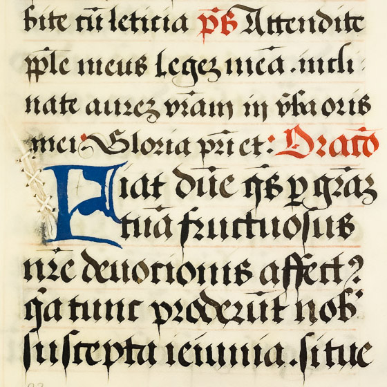 Zbliżenie na inicjał F, z widocznym małym „f” w środku (plus widoczne zaszycie pęknięcia pergaminu). Missale (Mszał Erazma Ciołka), BN 3306 III, k. 23r