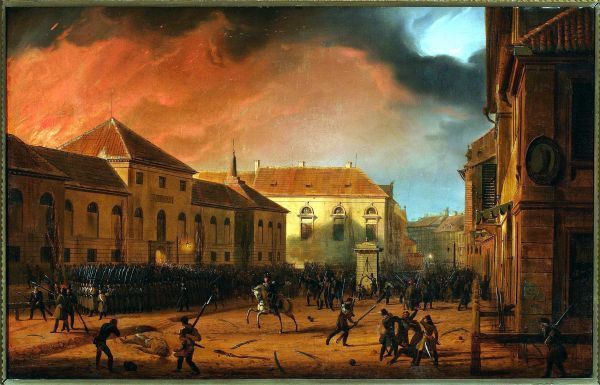 Starcie belwederczyków z kirasjerami rosyjskimi na moście w Łazienkach , obraz Wojciecha Kossaka (domena publiczna). Mikołaj I, który postrzegał siebie jako obrońcę ładu nie tylko w Rosji, ale i na całym kontynencie europejskim, nie spodziewał się, że rewolucja wybuchnie na terenach pod jego panowaniem. Wieczorem 29 listopada 1830 roku grupa spiskowców ze Szkoły Podchorążych podjęła się ataku na warszawski Belweder, gdzie rezydował książę Konstanty. Inna grupa ruszyła w stronę Starego Miasta nawołując mieszkańców stolicy do zrywu powstańczego. Tego wieczora rozpoczęła się tragedia powstania listopadowego. Wielu wybitnych polityków i wojskowych doskonale rozumiało, że bunt wobec potężnej Rosji i jej despotycznego władcy jest czynem irracjonalnym. Wiedzieli oni, że powstanie wywoła falę rosyjskiego nacjonalizmu, ale także będzie pretekstem dla sił antypolskich i cara, aby cofnąć Polakom konstytucję nadaną przez Aleksandra I w 1815 roku. Umiarkowani przywódcy zrywu przy tym szybko utracili władzę – ich miejsce zajęli ci bardziej radykalni.