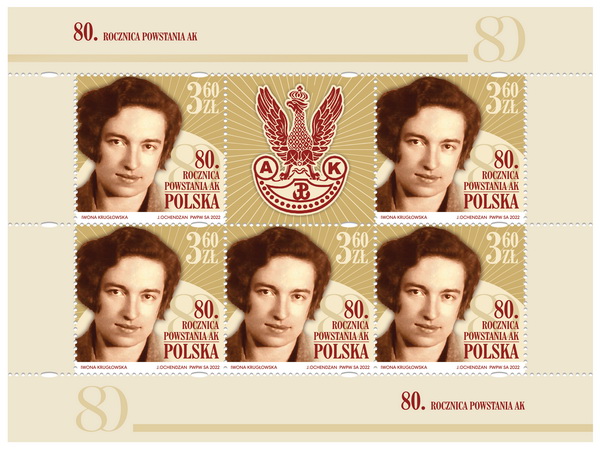 Znaczek okolicznościowy z artystycznie koloryzowanym zdjęciem Iwony Krugłowskiej, pochodzącym z archiwum Poczty Polskiej, zostaje wprowadzony do obiegu w nakładzie 135 000 sztuk. Jego autorem jest Jarosław Ochendzan. W prawym dolnym rogu znaczka umieszczono nazwę emisji „80. rocznica powstania AK” oraz napis: „POLSKA”, a w prawym górnym rogu oznaczenie wartości: „3,60 zł” .