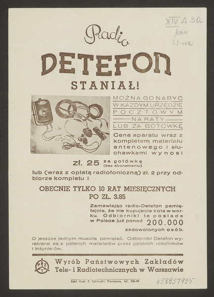 "Od 1 stycznia b.r. została obniżona cena odbiorników detektorowych Detefon, sprzedawanych w przez urzędy i agencje pocztowe. Po uwzględnieniu obniżki, cena Detefonu (z kompletem materiałów instalacyjnych i słuchawkami) wynosi 2 zł przy odbiorze i tylko 10 rat miesięcznych po 3 zł. W cenie tej mieści się już opłata za abonament radiofoniczny. Za gotówkę cena Detefonu wraz z kompletem materiałów wynosi 25 zł" – napisano w "Dzienniku Ostrowskim" z 12 lutego 1939 r. "Obniżka ceny podyktowana był względami natury społecznej. Celem obniżki było jak najdalej idące uprzystępnienie nabycia radia najmniej zamożnym warstwom społecznym. Dziś w dobie wydarzeń politycznych, jakich jesteśmy świadkami, kiedy burzliwe chmury kłębią się nad Europą, radio powinna mieć każda rodzina" – pisano dalej.