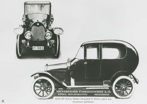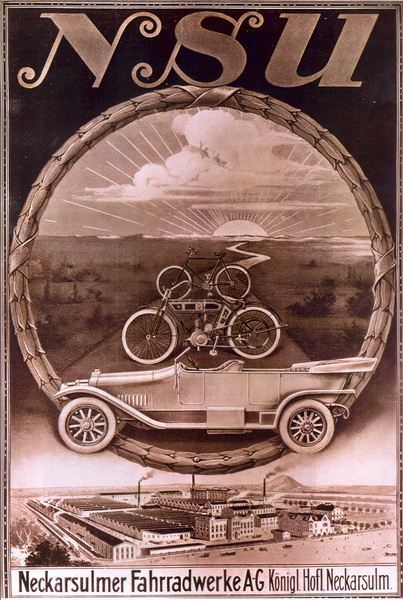 Założona w 1873 roku w Riedlingen przez Christiana Schmidta i Heinricha Stolla fabryka maszyn dziewiarskich, w 1880 roku przeniosła się do Neckarsulm, gdzie w 1884 roku została przekształcona w spółkę akcyjną. W 1886 roku firma trafiła na właściwy moment. Rowery stawały się coraz bardziej popularne, a właśnie wtedy NSU zaczęło je produkować i sprzedawać. W roku 1900 spółka zaczęła produkować również motocykle. Nowa nazwa marki N.S.U. (od NeckarSUlm) nagle stała się popularna na całym świecie. W 1906 roku zaprezentowano publicznie pierwszy Original Neckarsulmer Motorwagen - mały samochód z czterocylindrowym silnikiem chłodzonym wodą. W 1909 roku 1000 pracowników zakładu wyprodukowało 450 automobili. W roku 1914 firma z Neckarsulm po raz pierwszy zapisała się w historii motoryzacji: jej inżynierowie zbudowali NSU 8/24 PS z lekką, aluminiową karoserią.