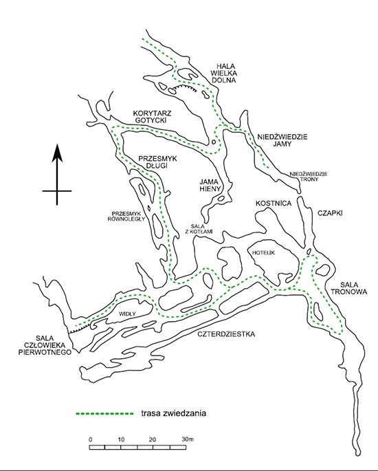 Zwiedzanie jaskini prowadzi przez siedem głównych sal i system korytarzy, tworzących spójną, niemal narracyjną trasę. Wędrówka rozpoczyna się w Przesmyku Długim, wąskim korytarzu, którego ściany zachowały osady z czasów prehistorycznych. Dalej pojawia się Sala z Kotłami, gdzie widoczne są kotły eworsyjne – ślady wirującej wody, która drążyła skałę z precyzją niedostępną dla ludzkich narzędzi.