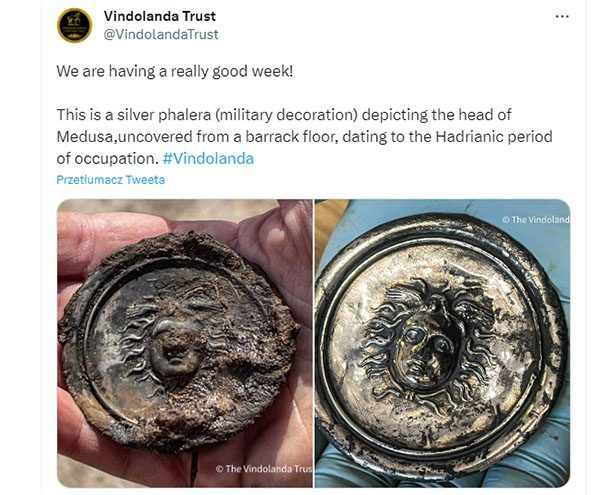 Na stanowisku archeologicznym Vindolanda będącego rzymską fortecą pomocniczą w północnej Anglii uczestnicy badań dokonali odkrycia ozdoby wojskowe (Phalera) liczącej ok. 1900 lat. Była ona przyznawana zasłużonym żołnierzom armii rzymskiej.