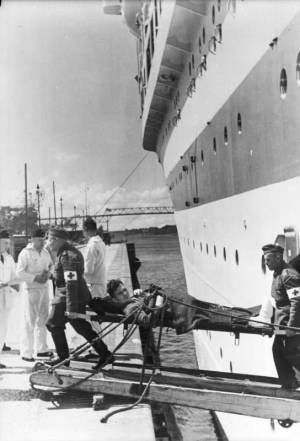 Ranni niemieccy żołnierze wyładowywani z Gustloffa w Kilonii, 1940 r. (fot. Augst, ze zbiorów Bundesarchiv, Bild 183-L05763, opublikowano na licencji Creative Commons Uznanie autorstwa – Na tych samych warunkach 3.0 Niemcy).